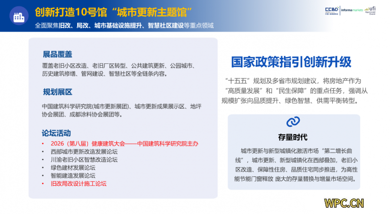 城市更新已成为驱动城市可持续发展的核心引擎。川渝地区存量房市场规模突破10亿平方米,旧改、局改政策持续落地,释放出巨大市场潜力。2026中国成都建博会精准把握这一战略机遇,倾力打造10号馆城市更新主题馆,聚焦旧城改造、局部更新、城市基础设施提升、智慧社区建设四大核心领域,为产业链上下游企业搭建起对接中西部市场的专业桥梁。