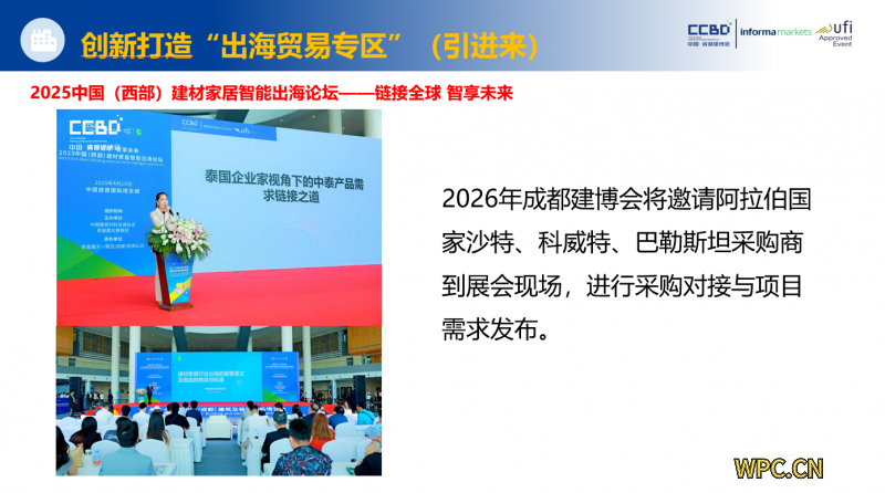 国家“一带一路”倡议持续推进,为企业出海贸易注入强劲动力。2025年一季度,我国货物贸易进出口总值同比增长1.3%,企业“走出去”的需求愈发迫切。2026中国成都建博会顺势而为,创新打造出海贸易专区,并举办系列出海论坛活动,搭建中国企业与国际市场的高效对接桥梁。